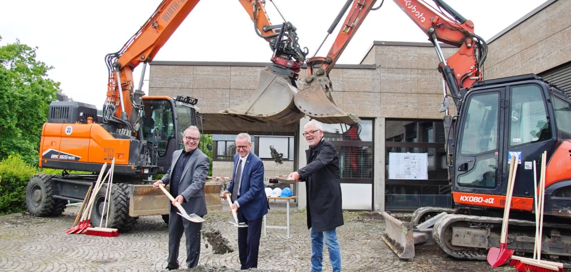 Beteiligt am Spatenstich waren Martin Berg und Klaus Peters vom Fachplaner „HMP Architekten“ aus Köln sowie Jens Wirth (Wirth-Bau) und Thomas und Tobias Koch (Weimer Bau) von den beteiligten Firmen. Wie David Schleifenbaum vom städtischen Fachdienst Gebäudemanagement mitteilte, beginnt jetzt die komplette Entkernung des Altbaus (inklusive Technik). Außerdem finden die Vorbereitungen für den Neubau des Restaurants statt.