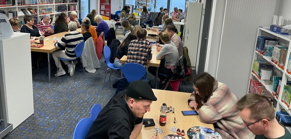 Eingeladen sind Spielebegeisterte aller Altersgruppen, die eigene Spiele mitbringen oder Spiele aus dem vorhandenen Angebot nutzen können. Auch beim zweiten Spieleabend Anfang April war „die Hütte“ (beziehungsweise das Stadthaus am Marktplatz) wieder voll. Mehr als 30 Personen nahmen jeweils an den ersten beiden Spieleabenden teil (siehe Foto).