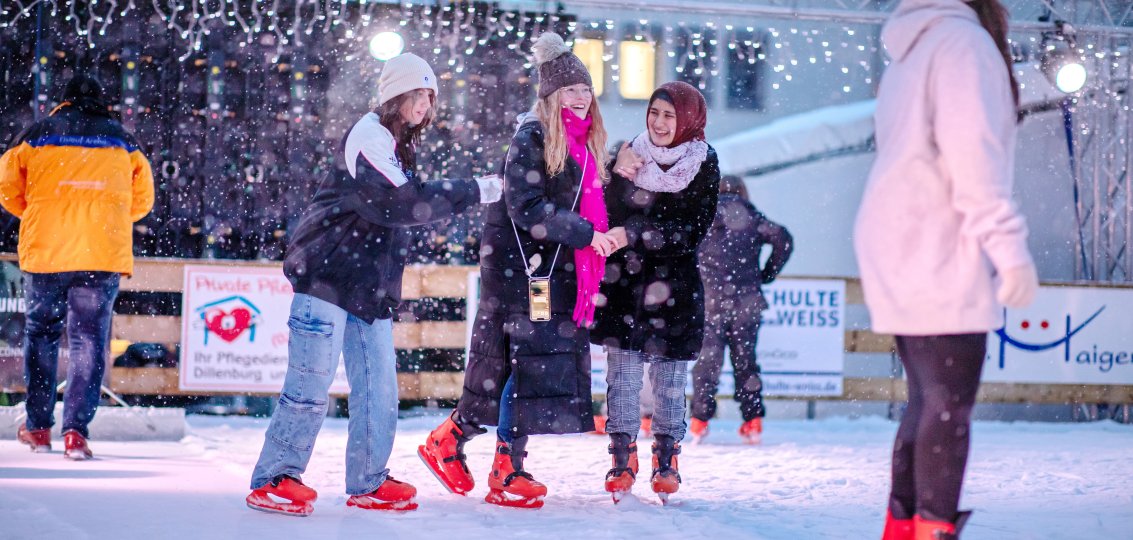 Ein Bummel durch die Innenstadt mit anschließendem Imbiss und einem Glühwein, ein Umtrunk mit Kollegen nach Feierabend oder ein Familienausflug zum Eislaufen – der Weihnachtsmarkt in Haiger ist eine echte Erfolgsgeschichte. Bürgermeister Schramm wünscht allen Wintersportlern viel Spaß auf der 15 mal 20 Meter großen Bahn. Auch dem Weihnachtsmarkt, der wieder vom Unternehmer Karsten Herold betrieben wird, wünschte er gutes Gelingen.