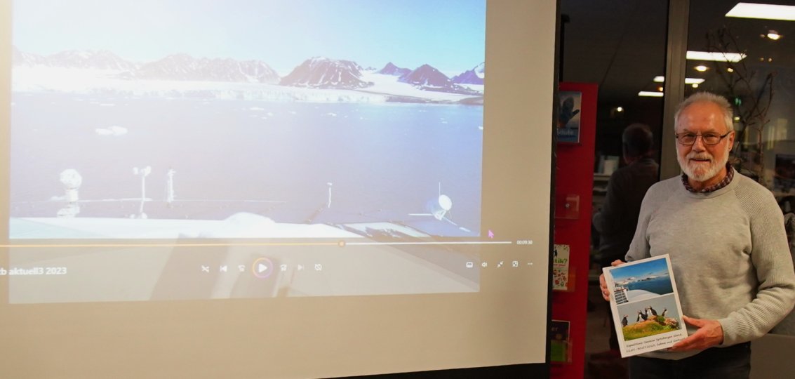 Eine abenteuerliche Reise in die arktische Inselwelt unternahmen die Besucher des Vortrages von Gerhard Knappstein in der Haigerer Stadtbücherei. Der aus Netphen stammende Hobbyfotograf hatte gemeinsam mit seiner Tochter im Jahr 2023 eine Expeditions-Seereise unternommen und nahm seine Zuhörer bei seinem bebilderten Vortrag mit in seine Erlebnisse hinein.