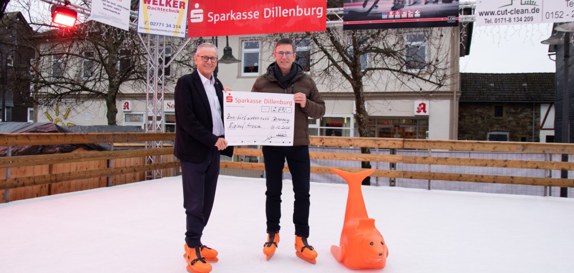 Die Sparkasse Dillenburg bringt ihre Verbundenheit zum Standort Haiger erneut zum Ausdruck und positioniert sich als starker Partner der Eislauf-Arena. Einen Scheck über 2570 Euro überreichte Michael Lehr, Vorstandsvorsitzender der Sparkasse, mitten auf der Eisfläche an Bürgermeister Mario Schramm. „Herzlichen Dank an die Sparkasse - Sie sind wirklich ein Top-Partner“, sagte Schramm im Namen des Haigerer Magistrats.