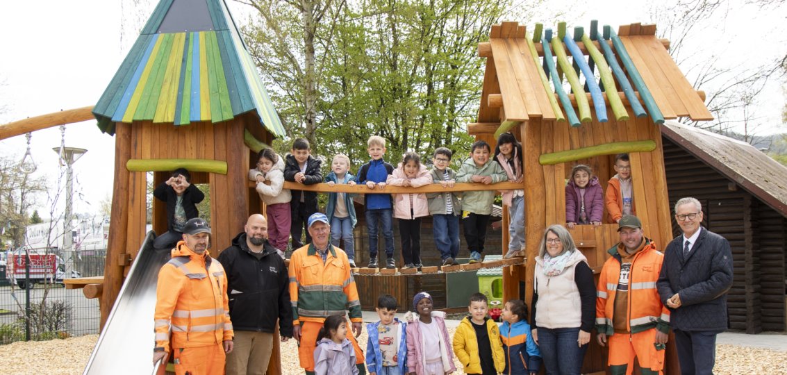 Mit scharrenden Füßen stehen die Kinder vor der Multifunktions-Spielanlage und können es kaum erwarten, endlich loszuklettern. „Cool!“ „Schön!“ beschreiben die Kids der Kindertageseinrichtung Bahnhofstraße ihren neuen Spielplatz. Die Erzieherinnen und Erzieher haben gemeinsam mit dem städtischen Bauhof und der Firma Olifu den Holz-Turm ausgewählt. Wichtig war, dass das Spielgerät die Ansprüche einer Bewegungskita erfüllt. Einzelne Wege auf dem Außengelände wurden zudem gepflastert, sodass die Lagerhäuschen besser erreichbar sind und die Kinder mit einem Bobbycar richtig „herumdüsen“ können.