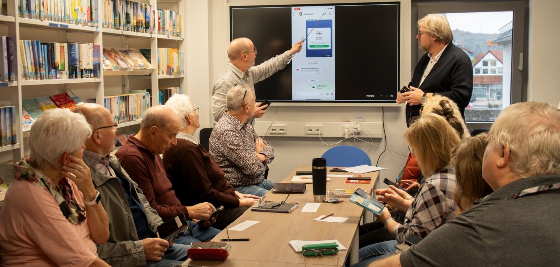 In der fröhlichen Runde in der Stadtbücherei musste niemand Hemmungen haben, etwas „falsch“ zu machen – Fragen konnten offen gestellt werden. Und die Di@-Lotsen erklärten Schritt für Schritt am Smartphone, wie vorzugehen ist. Dafür spiegelte Thomas Kröckel sein Handy auf den großen Bildschirm der Stadtbücherei, und jeder konnte sich parallel dazu am eigenen Handy oder Tablet ausprobieren. Zusätzlich zur Erklärung der Videotelefonie wurden bei der Gelegenheit auch weitere wichtige Funktionen des beliebten Nachrichtendienstes „WhatsApp“ erklärt - zum Beispiel die Diktierfunktion oder das Verschicken von Aufnahmen. Es wurde herzlich gelacht und gewitzelt, und auch der „Aha“-Effekt blieb nicht aus.