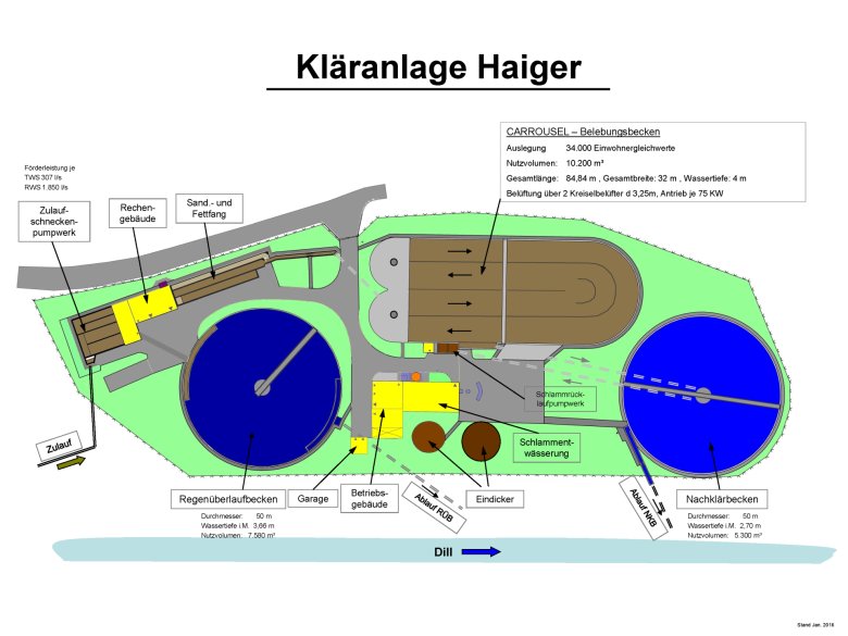 Die Kläranlage Haiger wurde 1982 als mechanisch-biologische Kläranlage mit einer simultanen aeroben Schlammstabilisierung zur Abwasserreinigung errichtet. In der damals für eine Ausbaugröße von 34.000 "Einwohnerwerten" (EW) ausgelegten Anlage werden die Abwässer der Stadt Haiger und von Teilen der Gemeinde Burbach behandelt. Insgesamt können bis zu 614 Liter/Sek. in der Anlage abwassertechnisch behandelt werden. Im Jahr werden somit fast 10.000.000 m³ Abwasser durch die Anlage gepumpt und behandelt.