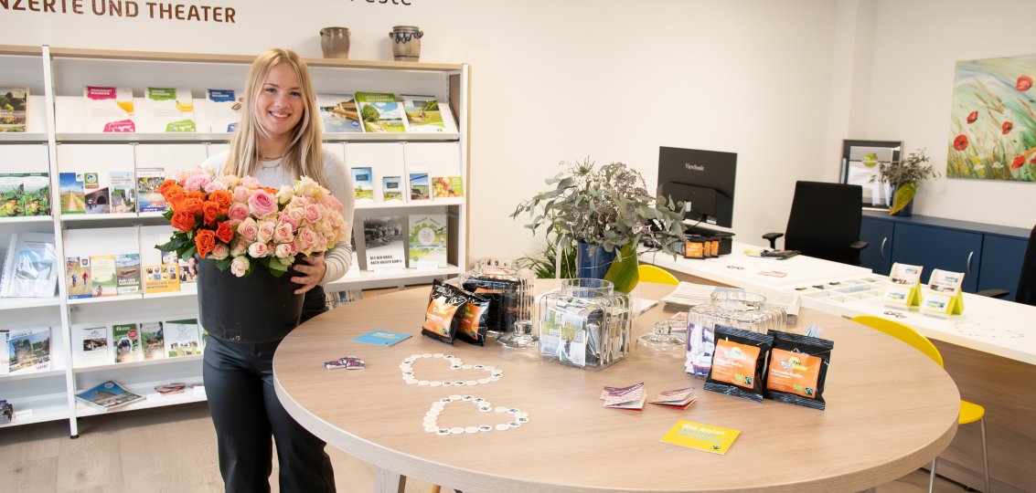 In der Touristinfo Haiger lagen verschiedene Infomaterialien aus, wie beispielsweise Infoblätter zur Beschaffung von Bananen, Orangensaft oder Kaffee, und zusätzlich zu den fairen Rosen gab es auch weitere kleine Geschenke. Wer auf den Geschmack von fairem Kaffee kommen will, durfte sich ein kostenloses Probierpäckchen mitnehmen. Interessant für viele war die Information, dass fair gehandelte Produkte wie Kaffee auch in den lokalen Supermärkten und Discountern erworben werden können – die Produkte sind schnell durch das Fairtrade-Siegel zu erkennen und können somit ohne Umstände in den Wocheneinkauf integriert werden.